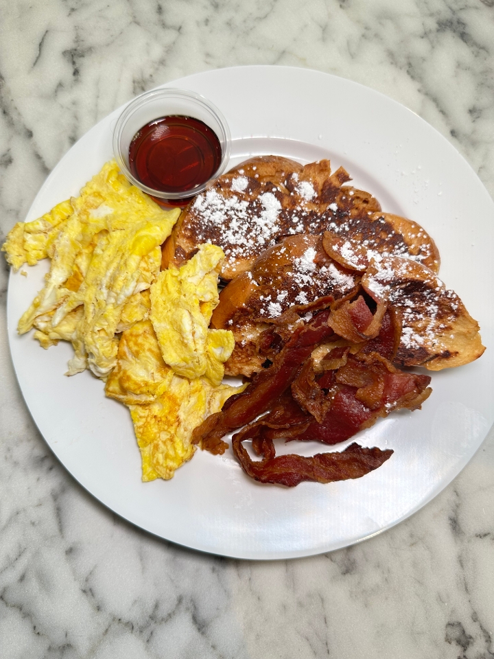 Two pieces of French Toast, two scrambled eggs, two strips. Served with real maple syrup,