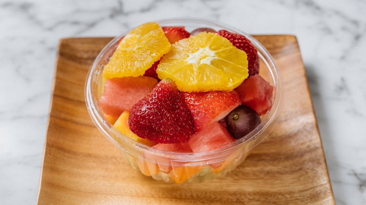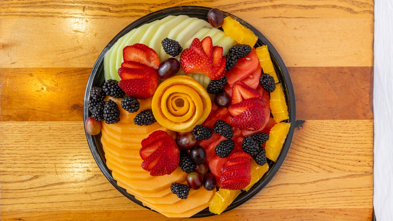 Seasonal fresh cut Watermelon, Strawberries, Honeydew, Cantaloupe, Pineapple, Seedless Grapes, Orange wedges.