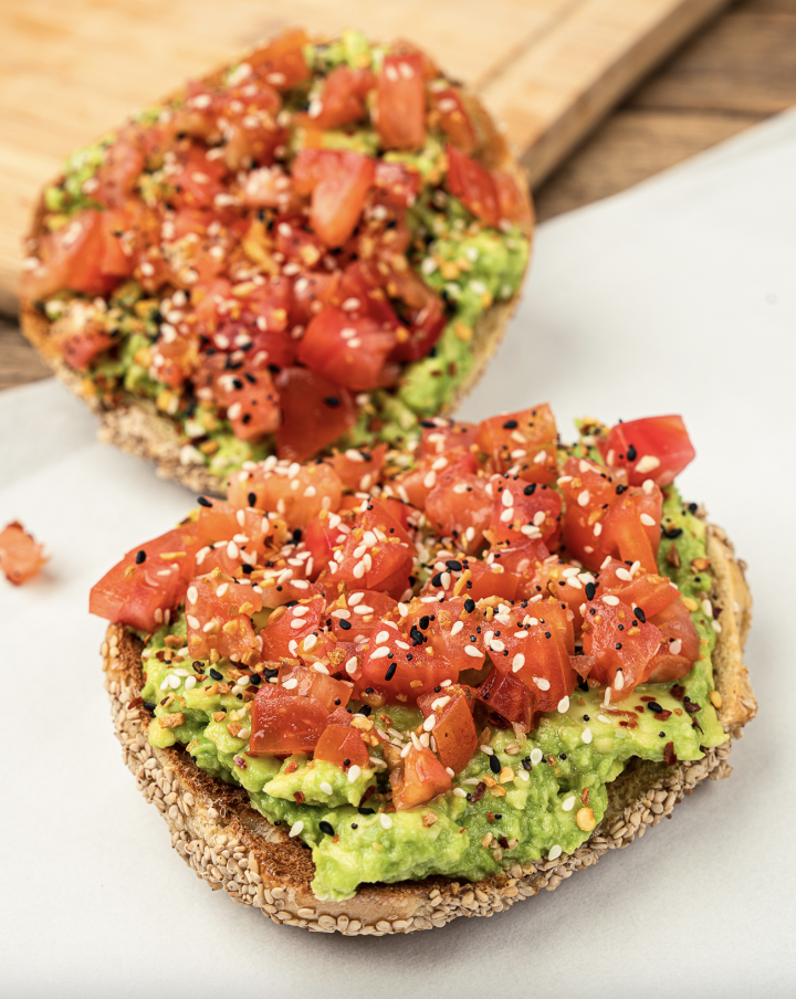 Open face bagel, with smashed avocado and chili flakes, grated cotija cheese, chopped tomatoes
