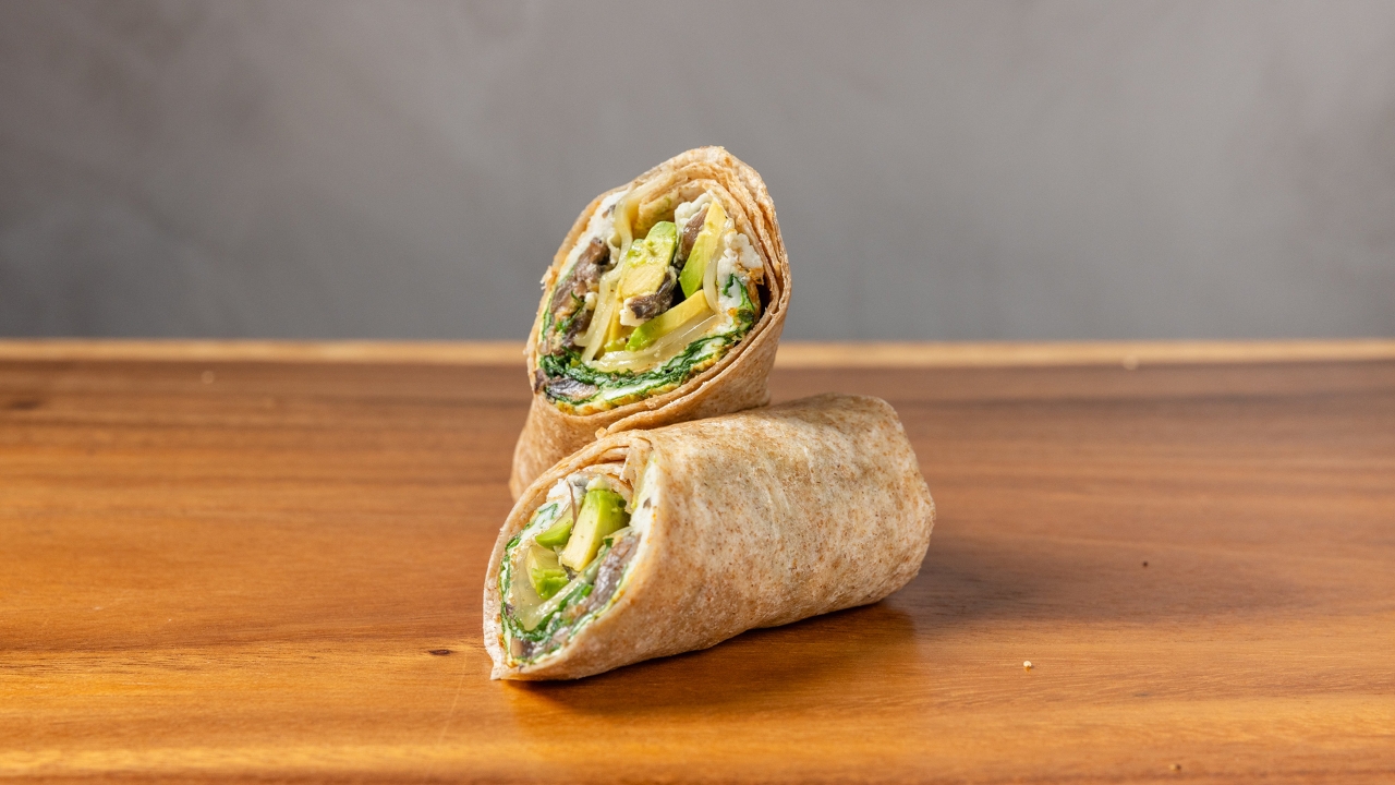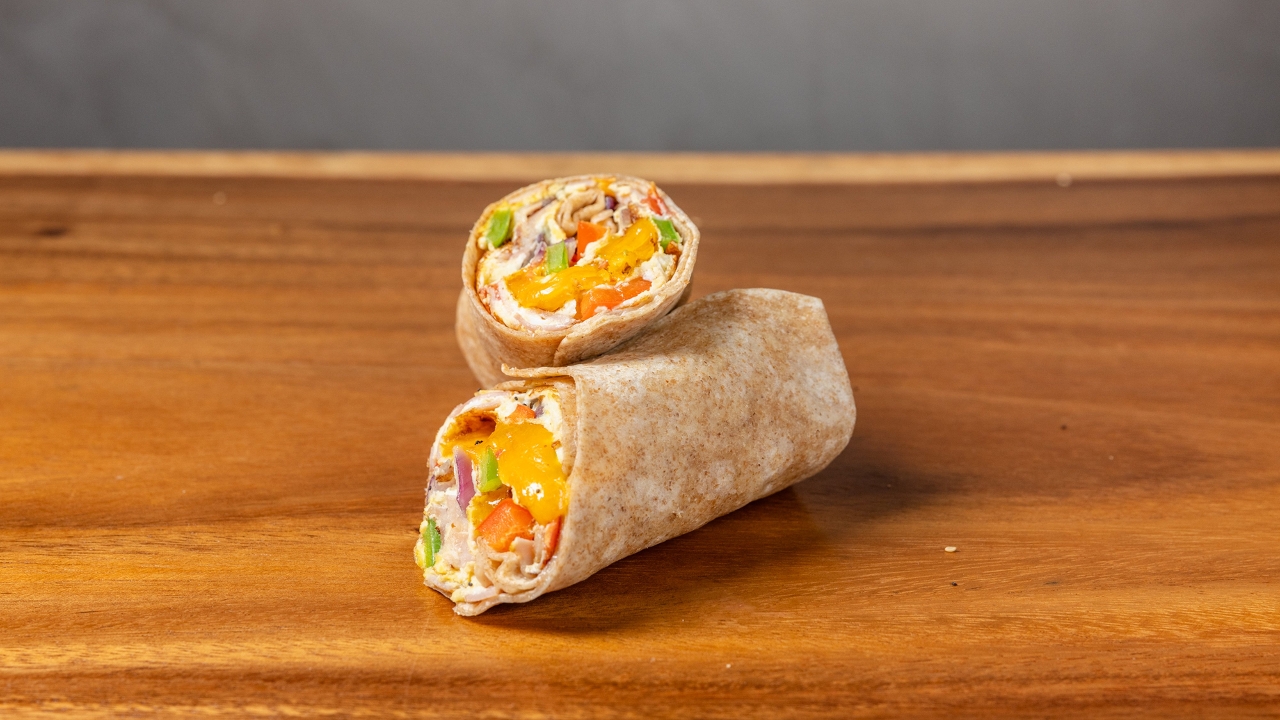 Grilled turkey, Swiss cheese, avocado and egg whites. whole wheat wrap.