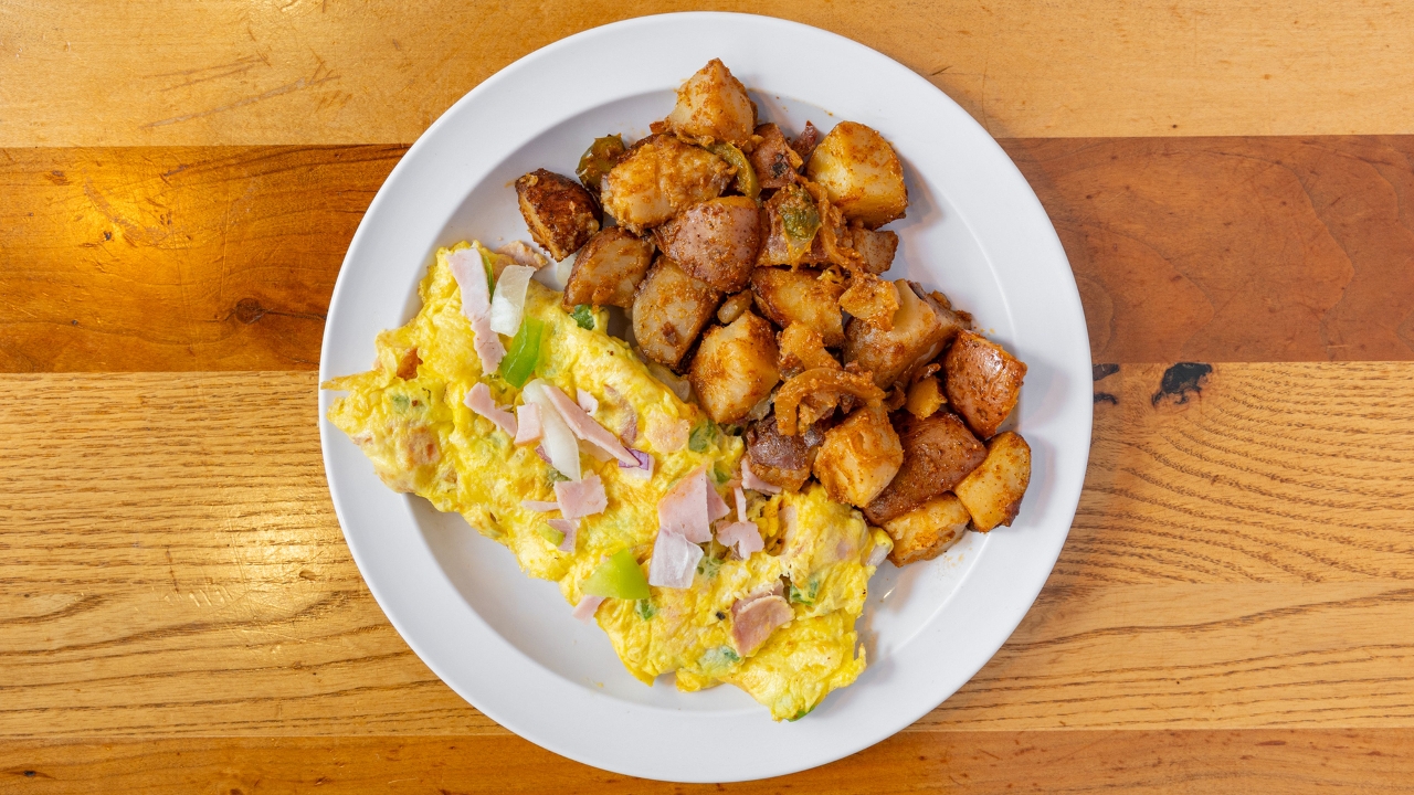 two eggs,Ham, bell peppers, onions, served with Home fries, and Bagel With Butter.