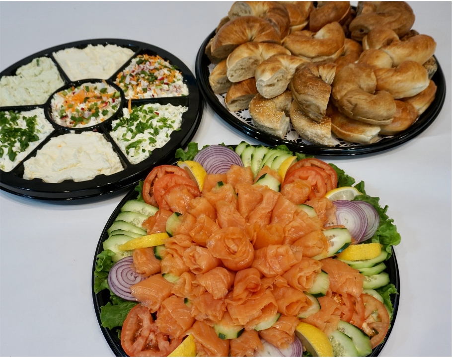 An assortment of our classic New York Bagels with your choice of 3 flavors of cream cheese and hand-sliced eastern Nova Scotia Salmon. Served with beefsteak tomatoes, cucumbers, red onions and capers.