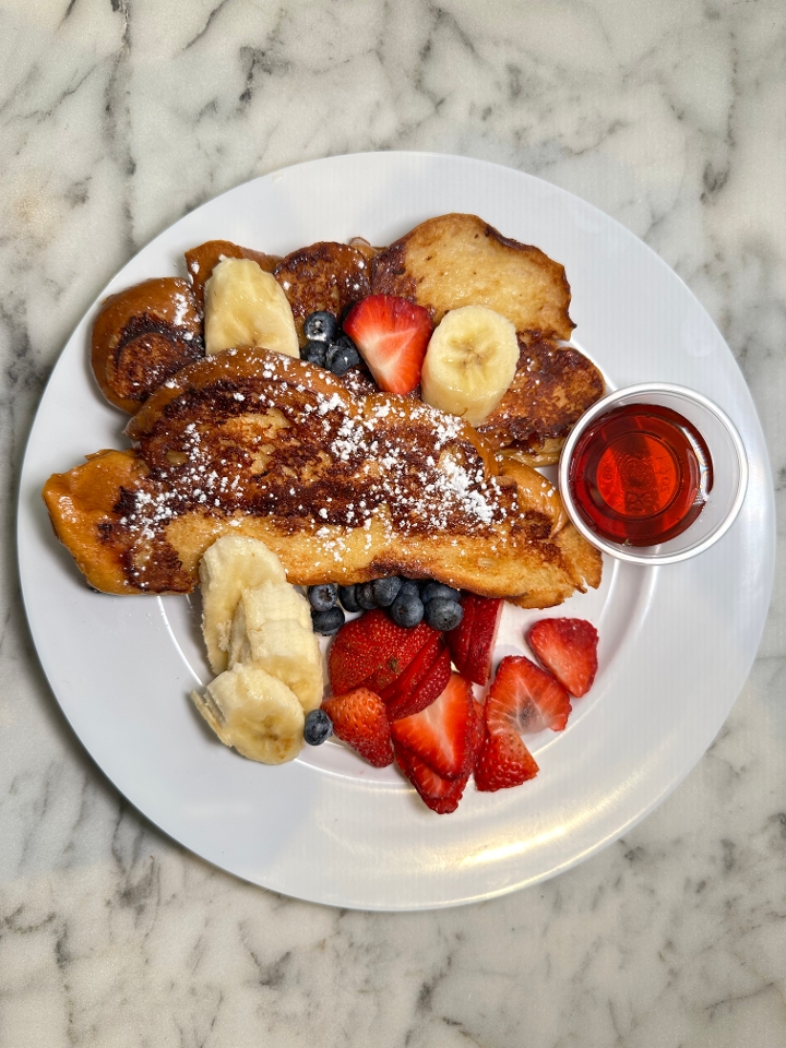 Two pieces of French Toast with strawberries and bananas, served with real maple syrup.