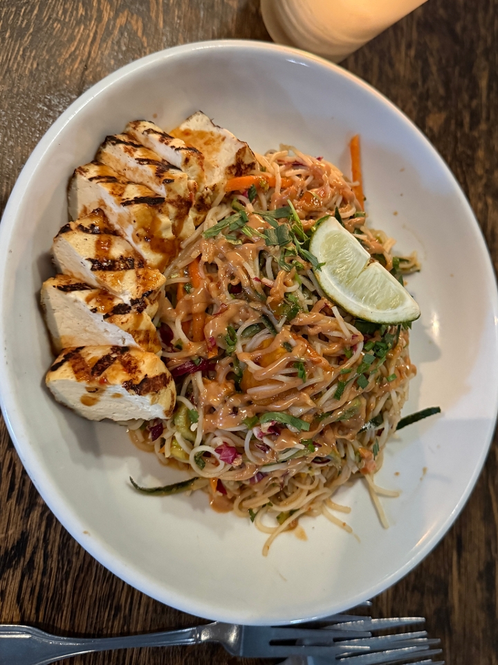 Chilled rice noodle salad with spiced lime peanut sauce, fresh herbs, cucumber, carrot, radicchio, squash, lime, and crushed peanuts.