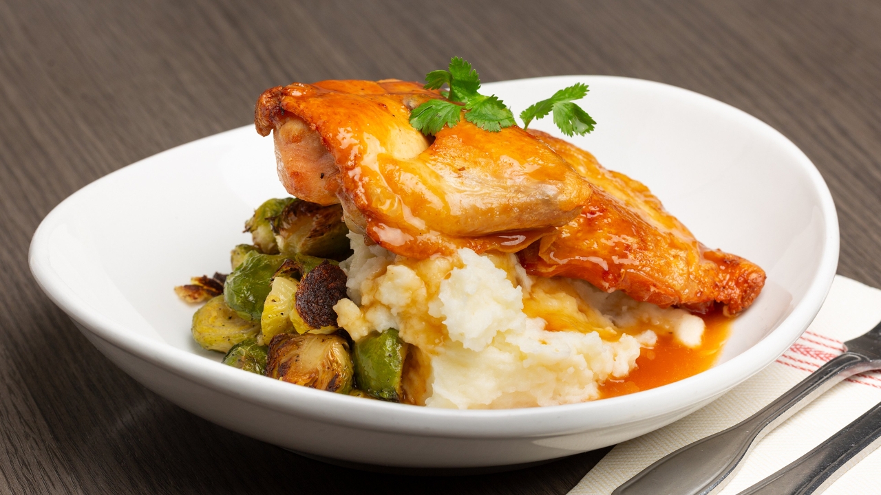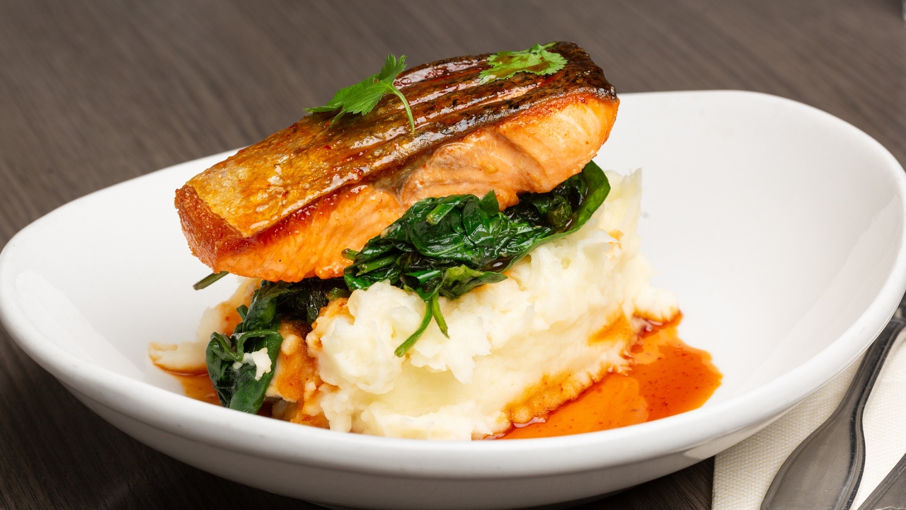 Mashed potatoes, seared spinach, Asian ginger jus. (Gluten-free)