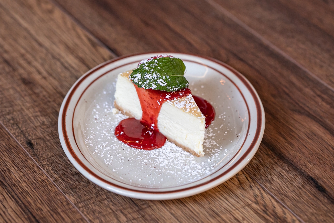 Homemade New York Style Cheesecake served with Strawberry Compote. (Gluten-free)