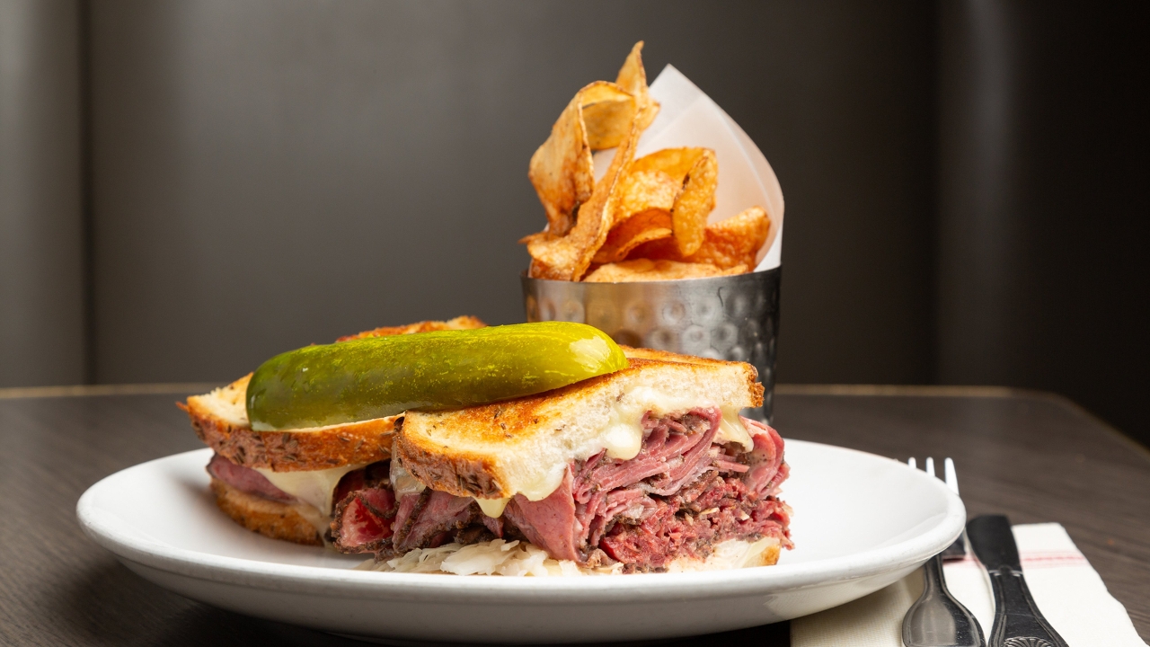Sauerkraut, Gruyere and Russian dressing on grilled rye bread, vinegar chips