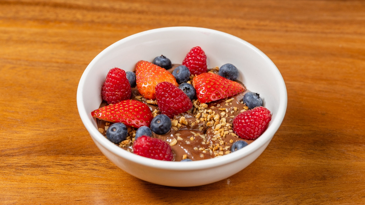 Topped with banana strawberries blueberries home made granola & Nutella drizzle .