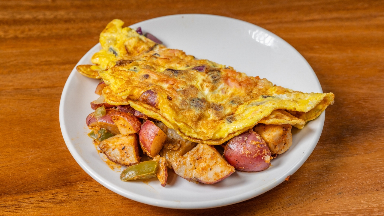 Eggs, ham, bell peppers, onions, served with home fries and bagel with butter.