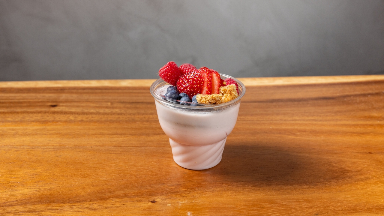 Non-fat strawberry yogurt served with mixed berries and homemade granola.
