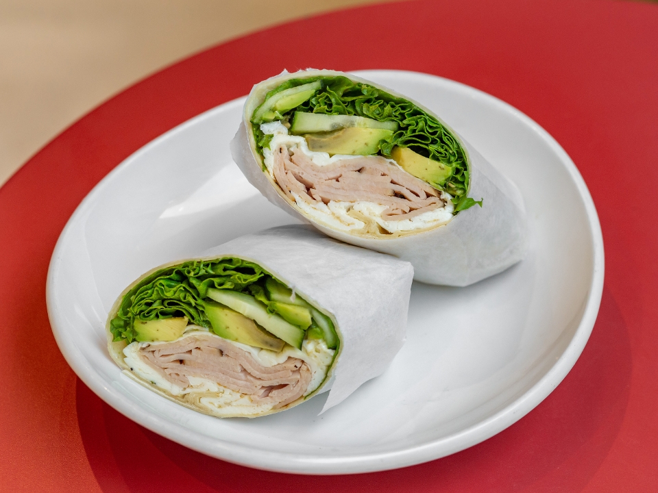 Grilled turkey, egg whites, avocado, Swiss cheese, on whole wheat wrap.