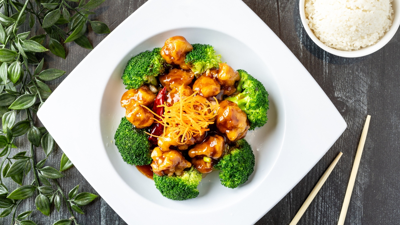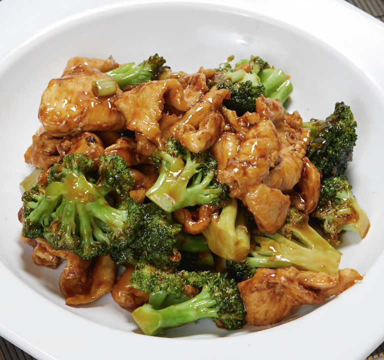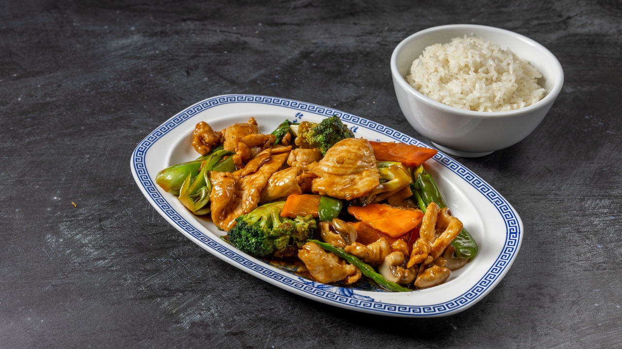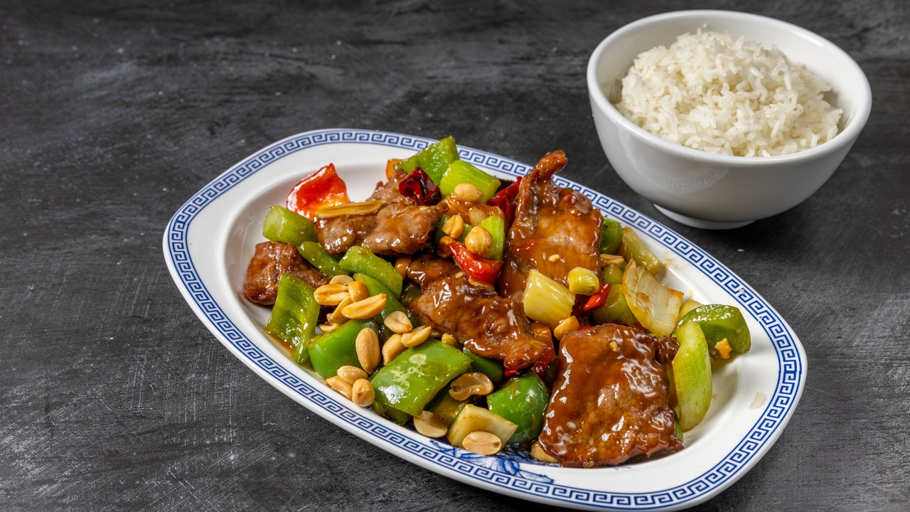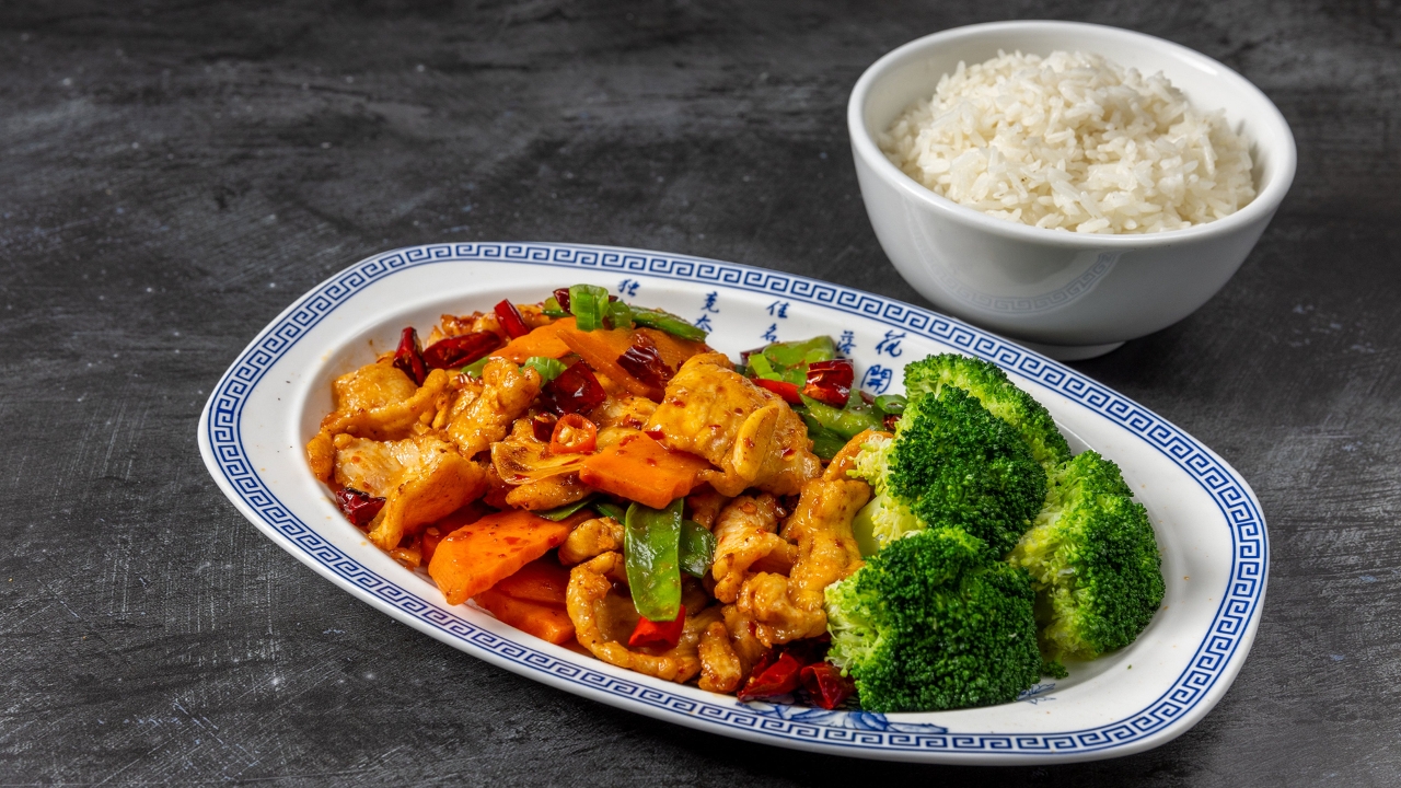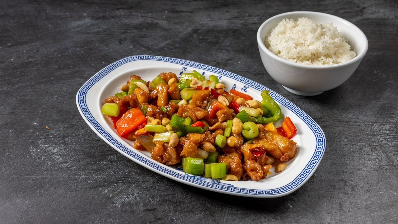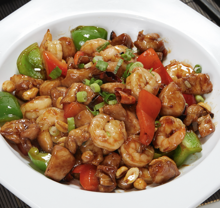 Chicken and shrimp sauteed with vegetables and peanuts in spicy sauce.