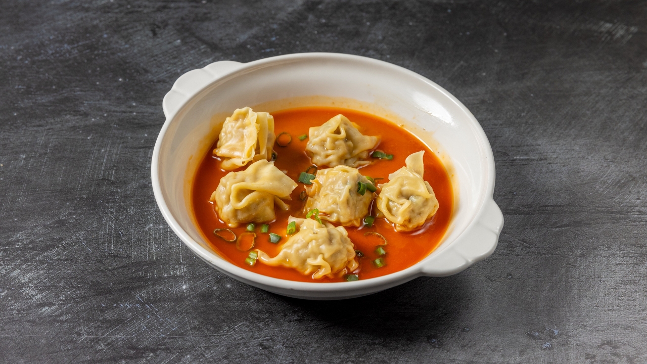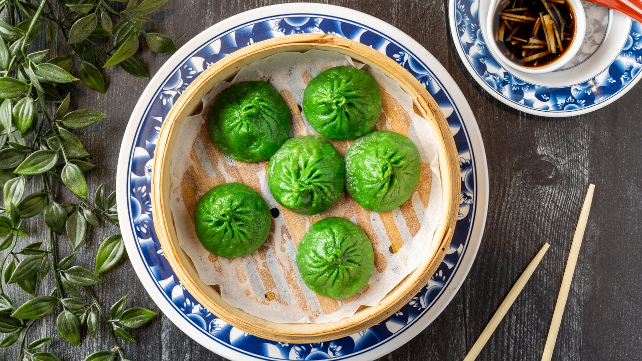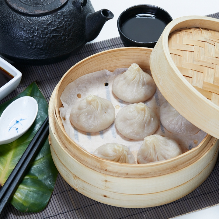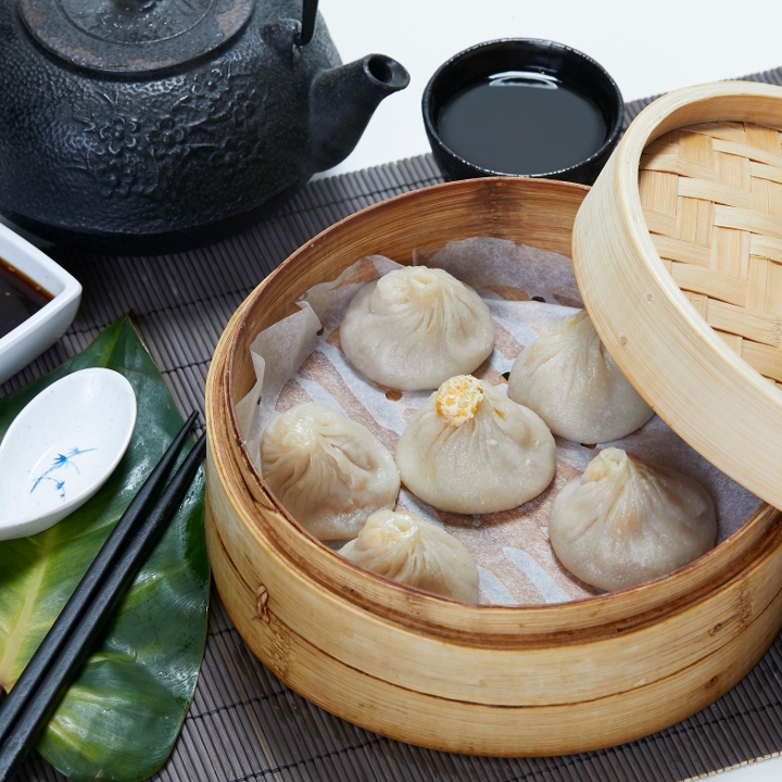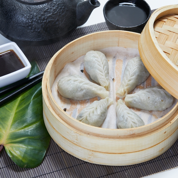 Soup dumpling featuring Impossible meat in vegetable broth. (Vegan, Vegetarian)