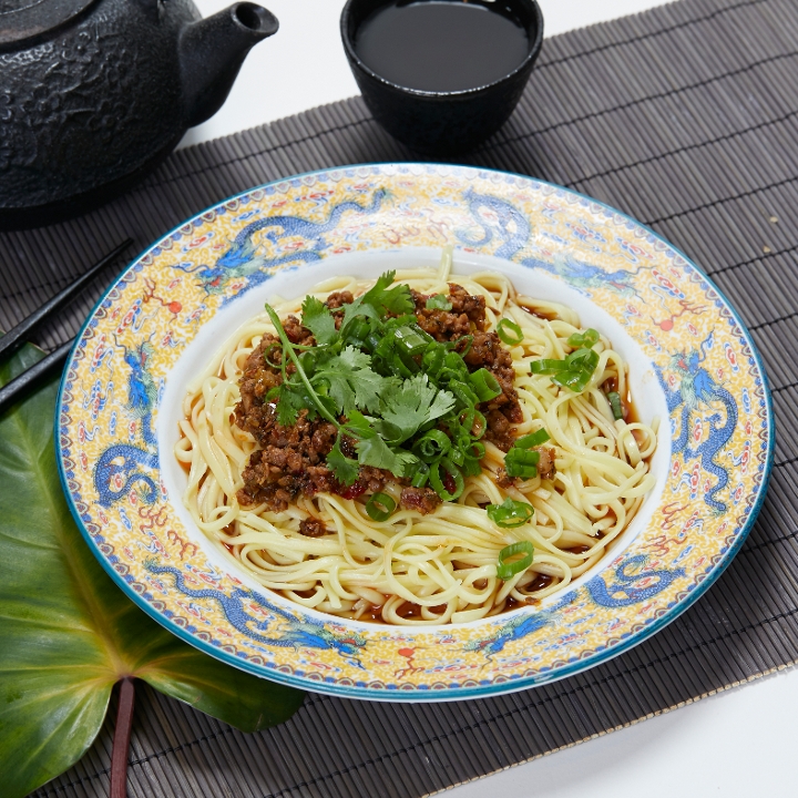 Spicy minced Impossible meat over peanut sauce noodles. (Vegetarian)
