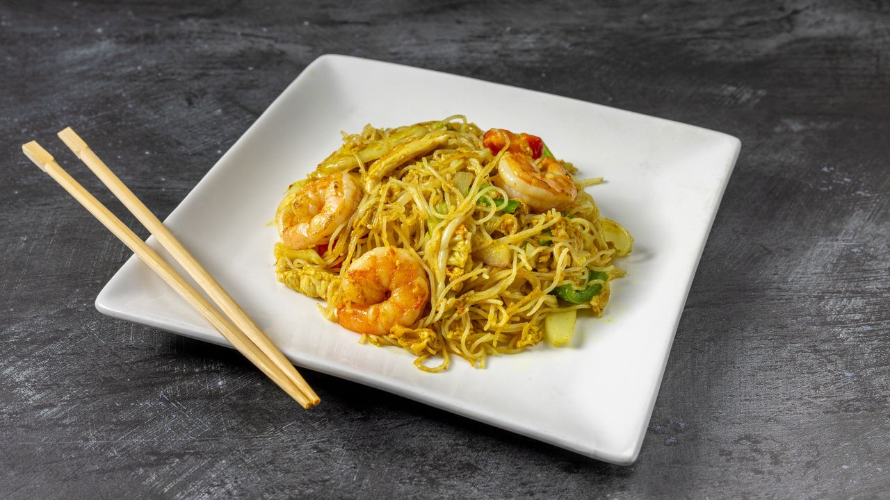 Chicken, shrimp, & pork w. curry flavor. Contains egg. (Gluten-free)