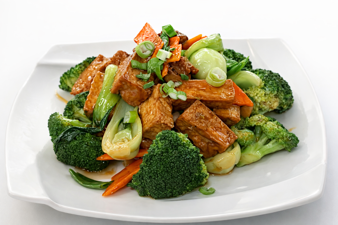 Firm tofu with bok choy, broccoli, mushrooms and carrots Served with white or brown rice