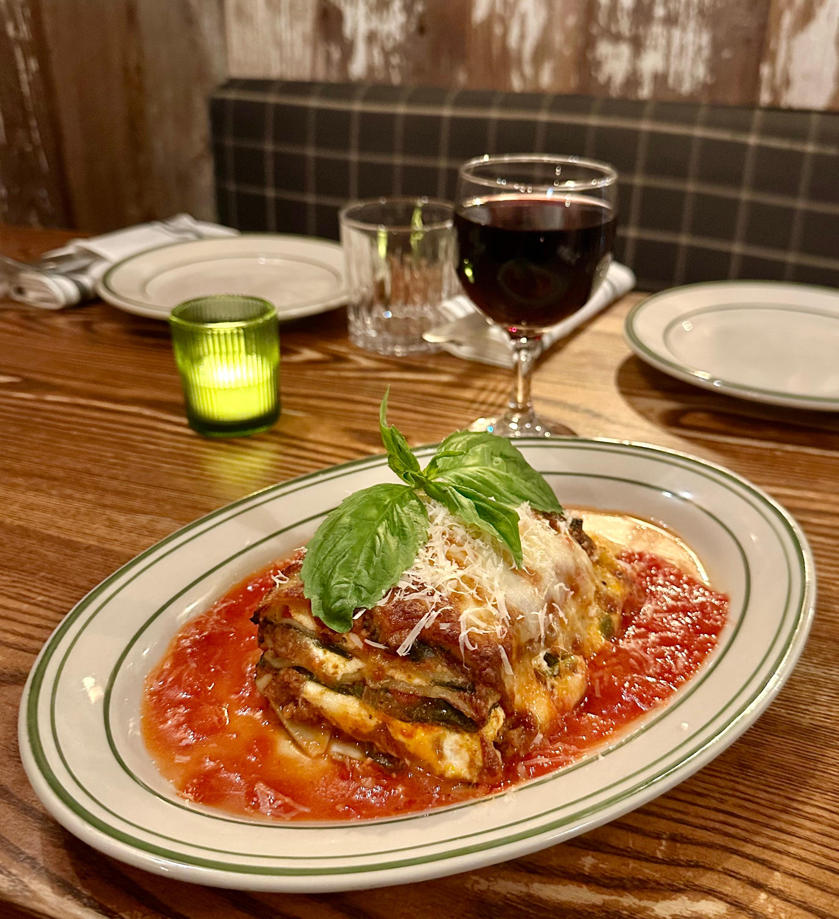 Classic Eggplant Parm, with basil and side of marinara. Served on ciabatta bread.