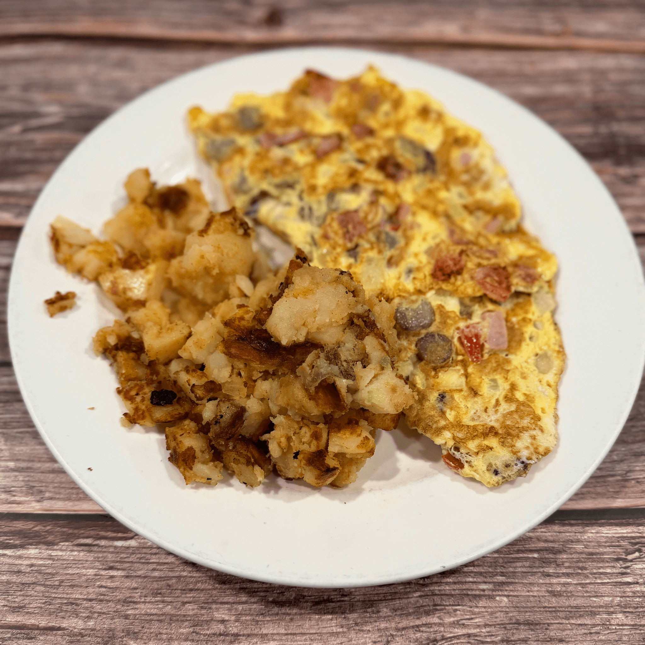Ham, peppers, onions. Served with potatoes & toast