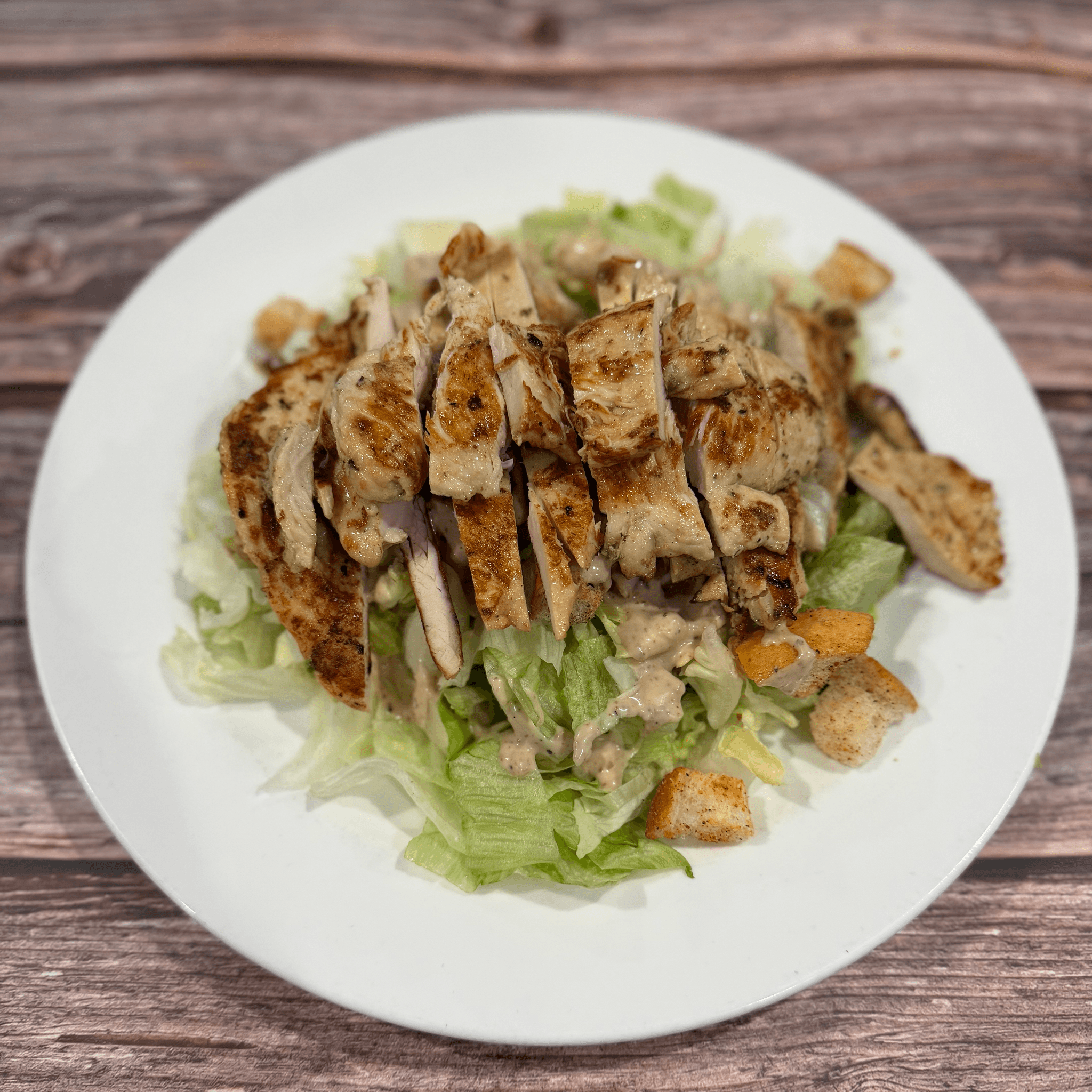 Grilled breast of chicken over mixed greens with tomatoes, cucumbers, onions, olives, hard boiled egg, avocado and bacon bits