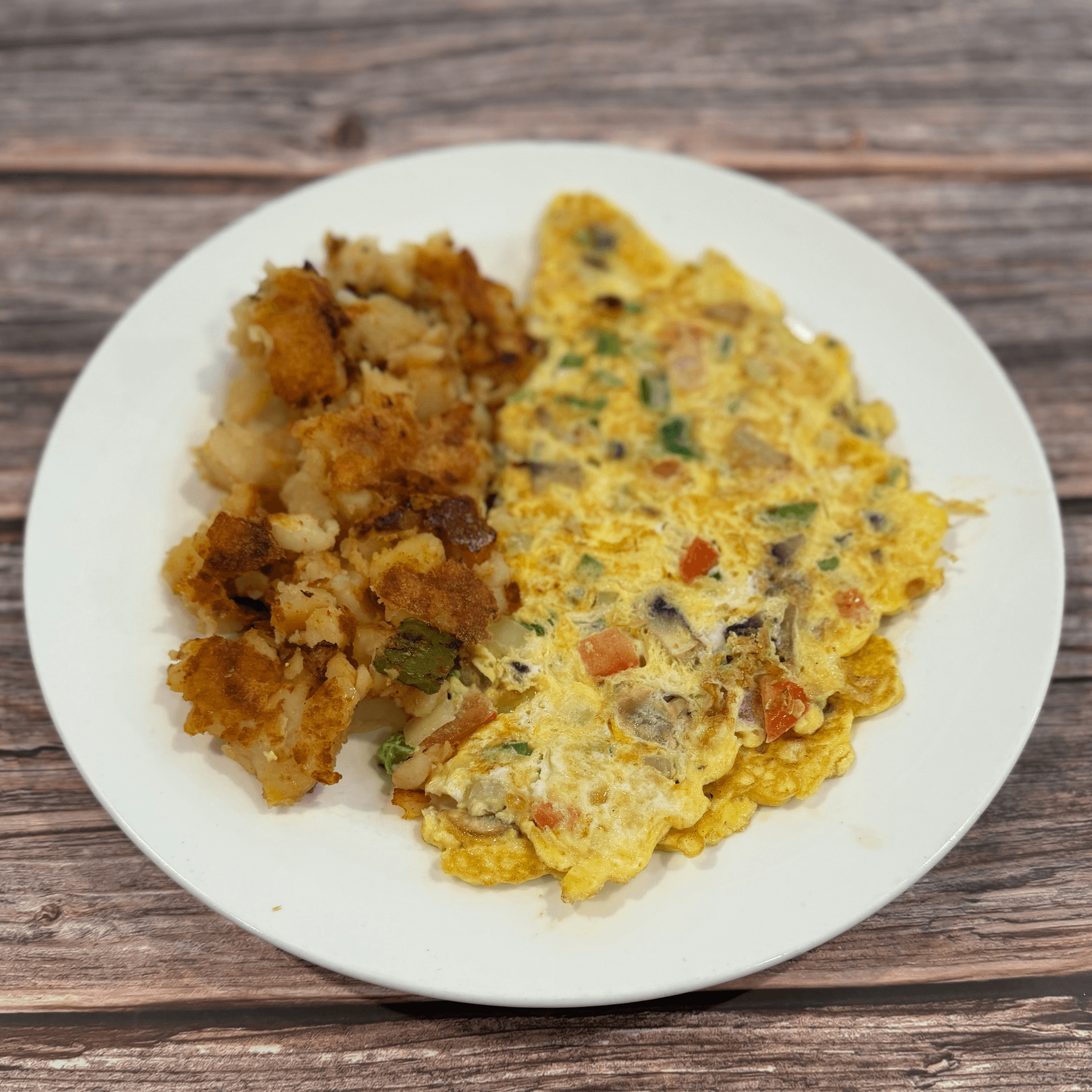 Peppers, onions, tomato, mushrooms. Served with potatoes & toast