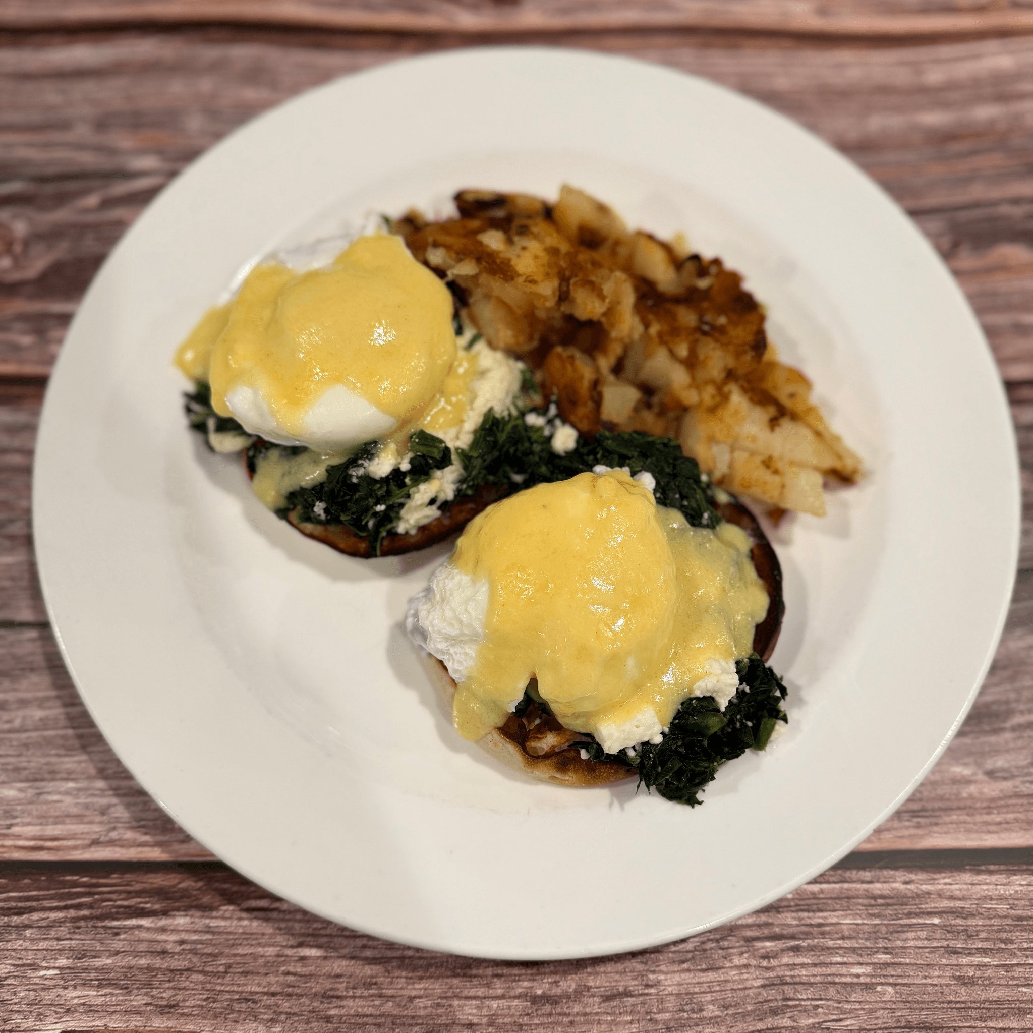 With spinach & feta. Two poached eggs on toasted English muffin topped with hollandaise sauce, served with potatoes