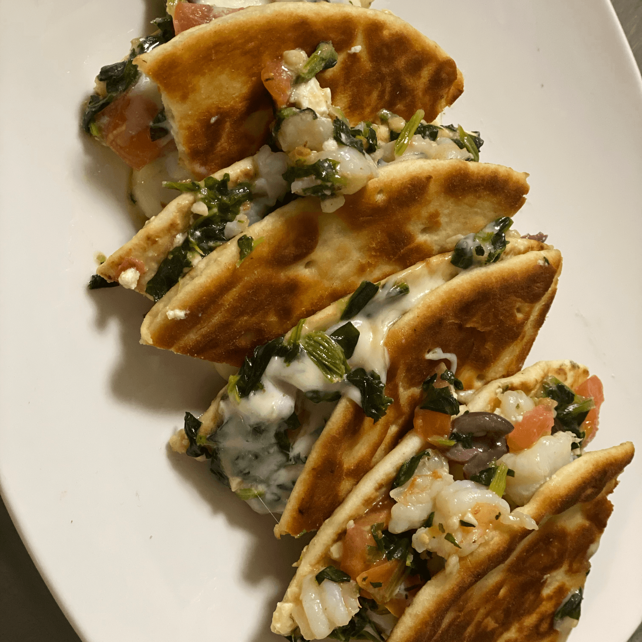 Shrimp, spinach, grilled tomatoes, feta cheese, kalamata olives, and mozzarella cheese