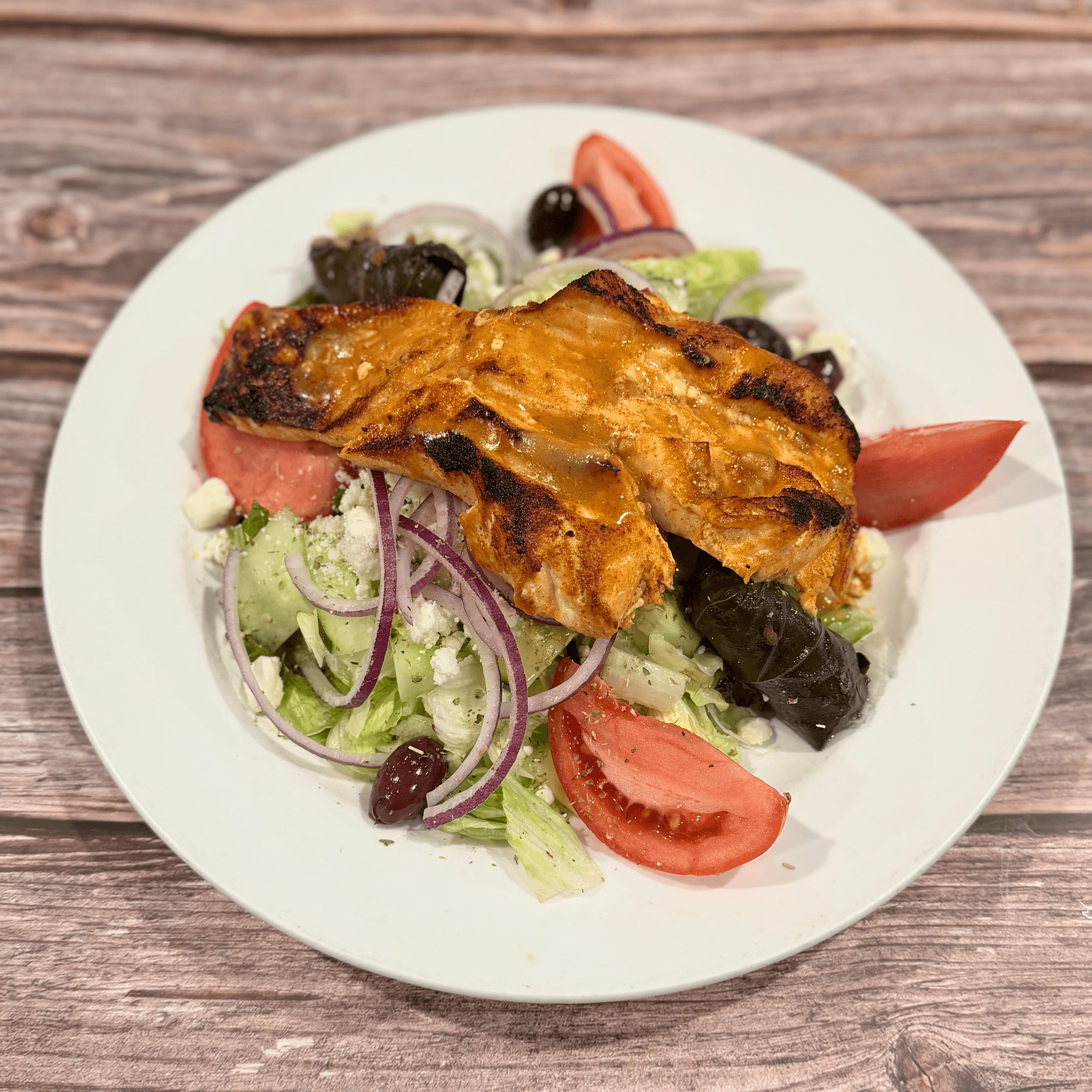 Crisp iceberg lettuce with tomatoes, cucumbers, olives, onions, feta cheese & stuffed grape leaves