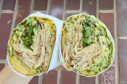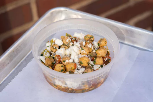 Marinated chickpeas and tomatoes, pickled peppers, olives, topped with crumbled feta.