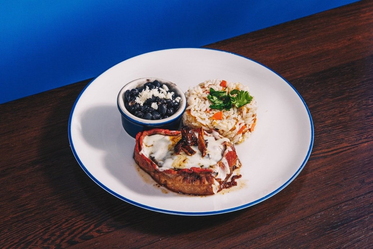 Grass fed filet mignon, wrapped in thick bacon, blanketed in Oaxaca cheese, served with rice and beans