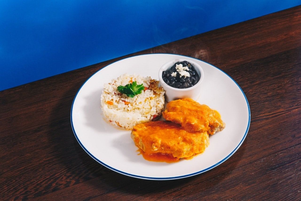 Breast of chicken rolled around a sweet plantain, bathed in a garlic-chipotle béchamel sauce, served with roasted potatoes or rice and beans