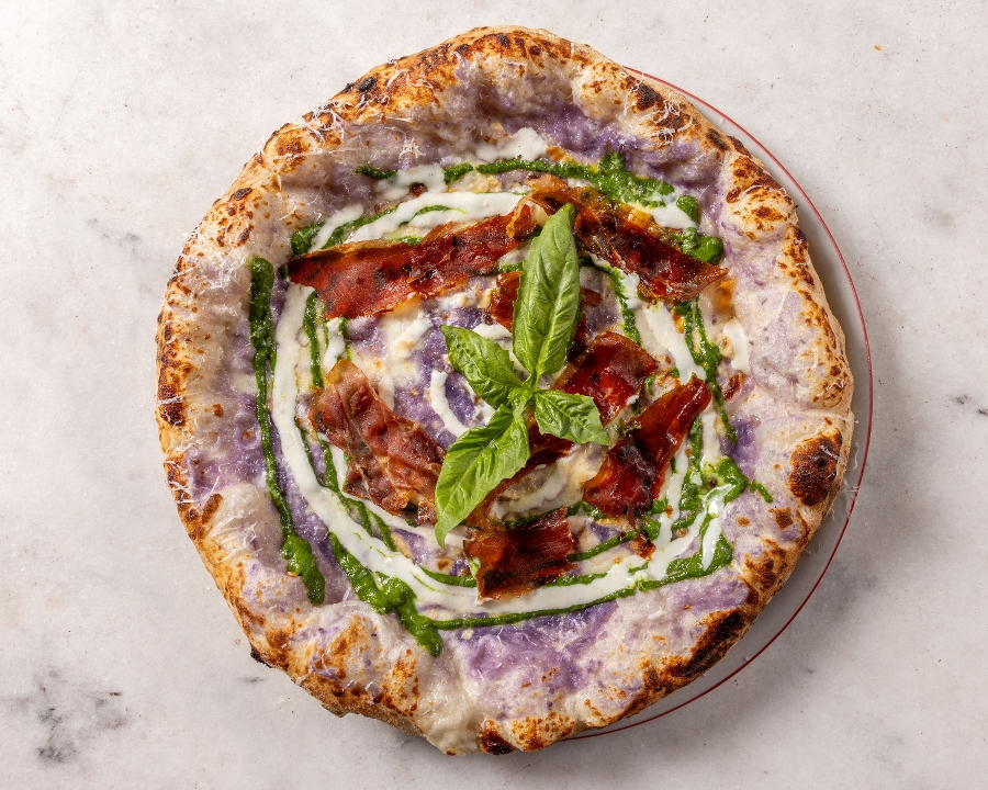 Purple Potatoes, Basil Pesto, 36 Month Aged Red Cow Parmigiano Reggiano Fondue, Crunchy Ham, Smoked Fior di Latte from Agerola
