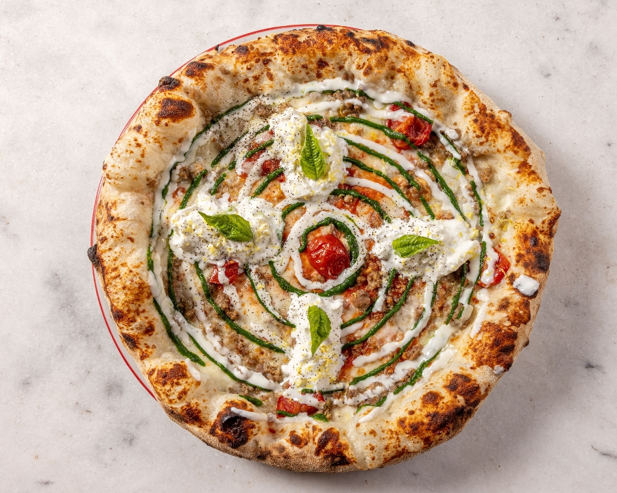 Rughetta Pesto, Datterini Tomatoes, Stracciatella, Mangalitza Sausage, Lemon Zest