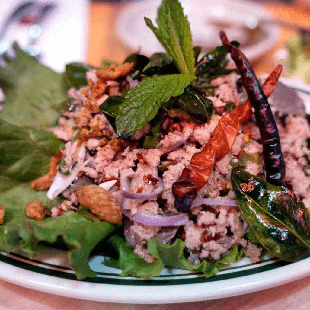 Minced chicken with charred galangal, chili lime fish sauce, mint, onion, scallion, and fried lime leaves
