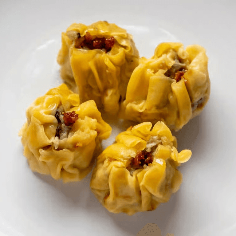 Ground shrimp chicken mushroom steamed wrapped with wonton skin served with sweet soy sauce