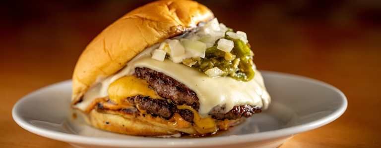 Juicy beef patty with cheese, onion and jalapeno pickles on a toasted potato bun, with our house seasoning, zaab sauce, onion confit