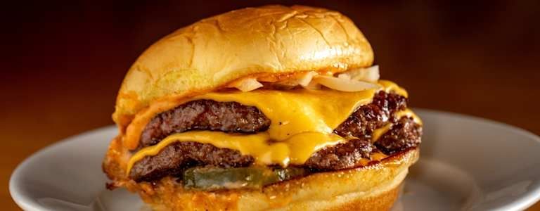 Classic smash burger, juicy beef patty with cheese, onion and pickles, zaab sauce on a toasted potato bun