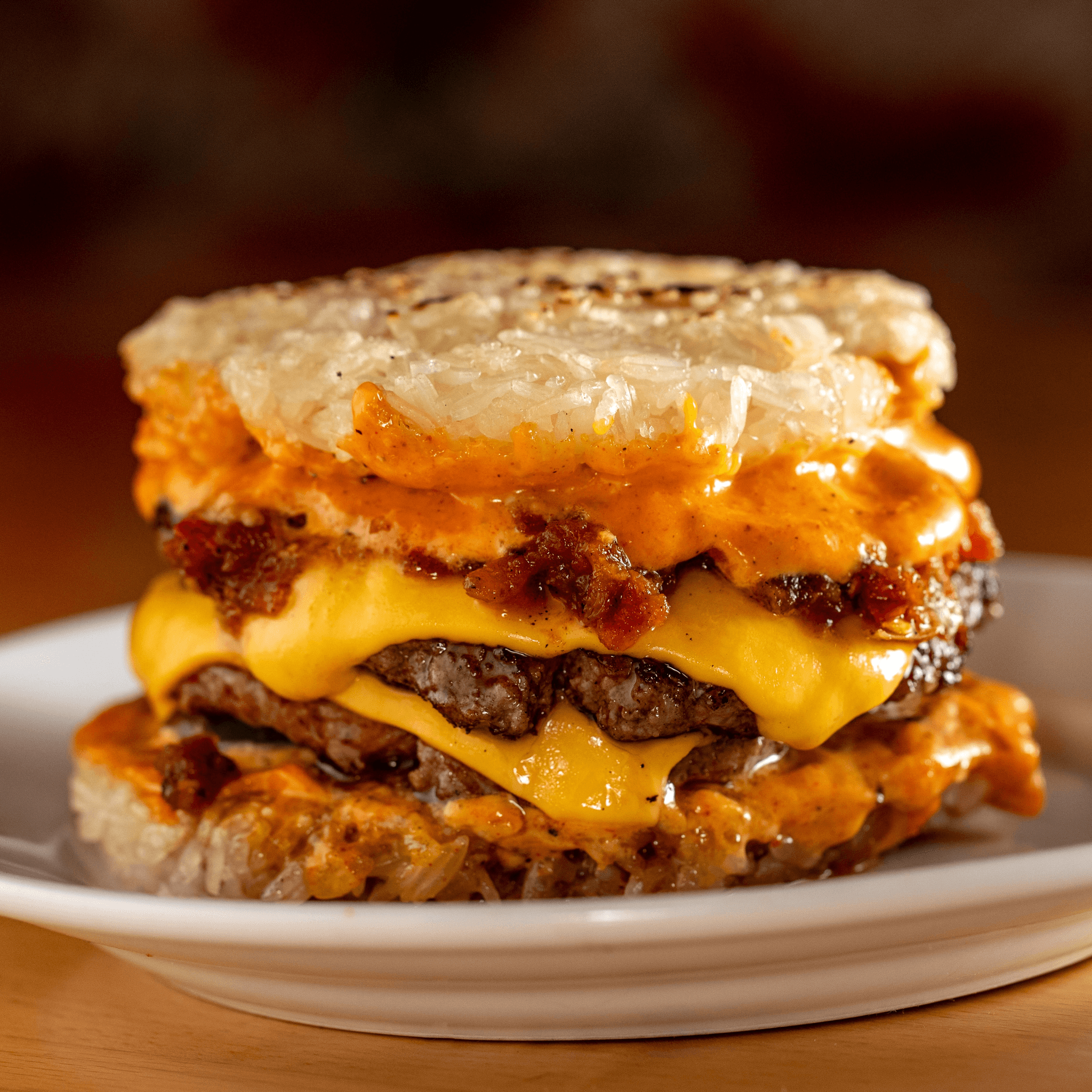 Grilled sticky rice smash burger, namprik ong with cheese, onion, jalapeño pickles, zaab sauce.