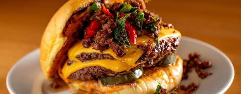 Juicy beef patty with cheese, onion and pickled jalapenos on a potato bun, topped with ka pow beef. Ka pow is wok tossed hand chopped beef with bird chili, garlic thai hot basil