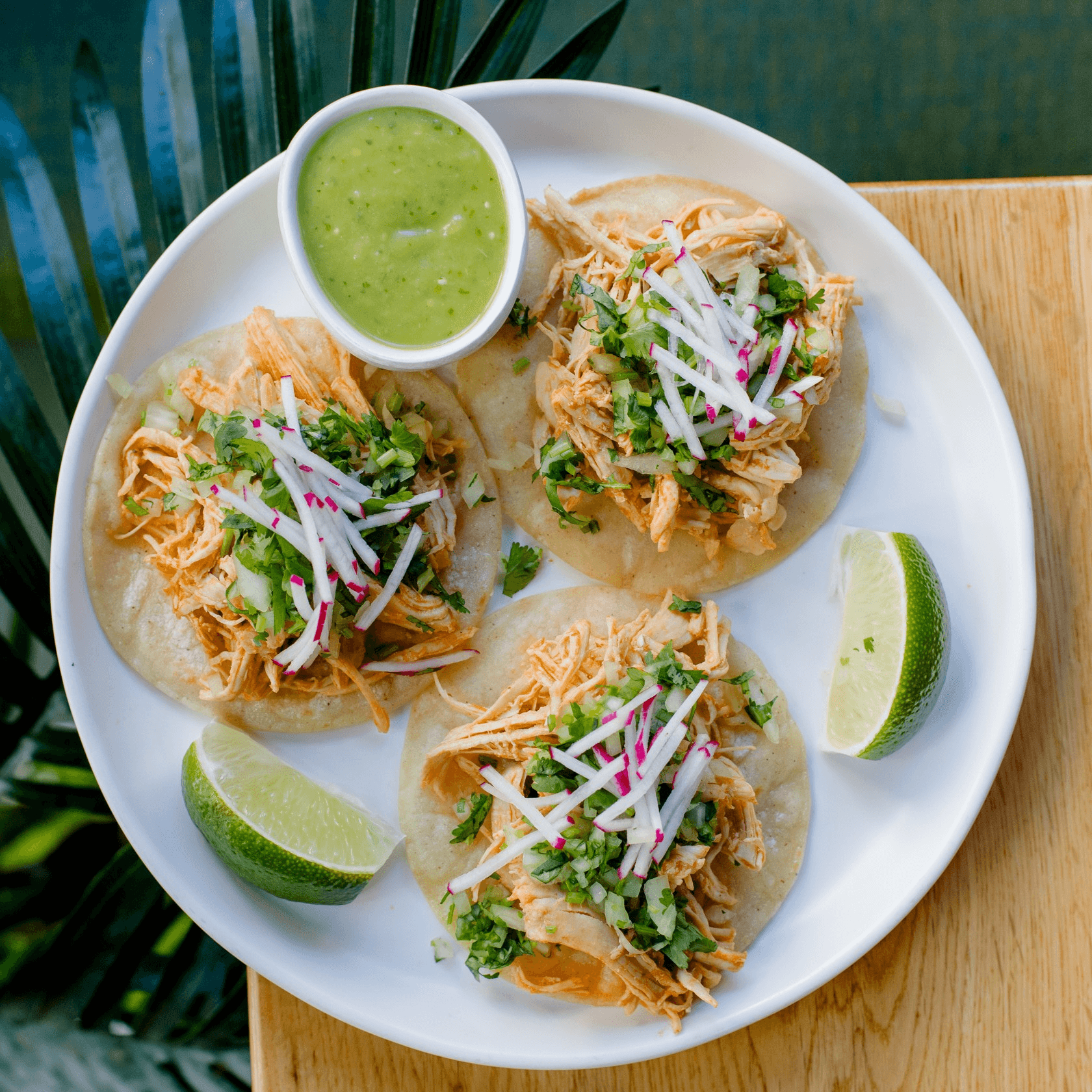 Shredded Chicken, Tomato-Serrano Sauce, Queso Fresco, Crema, Lettuce, Raddish.