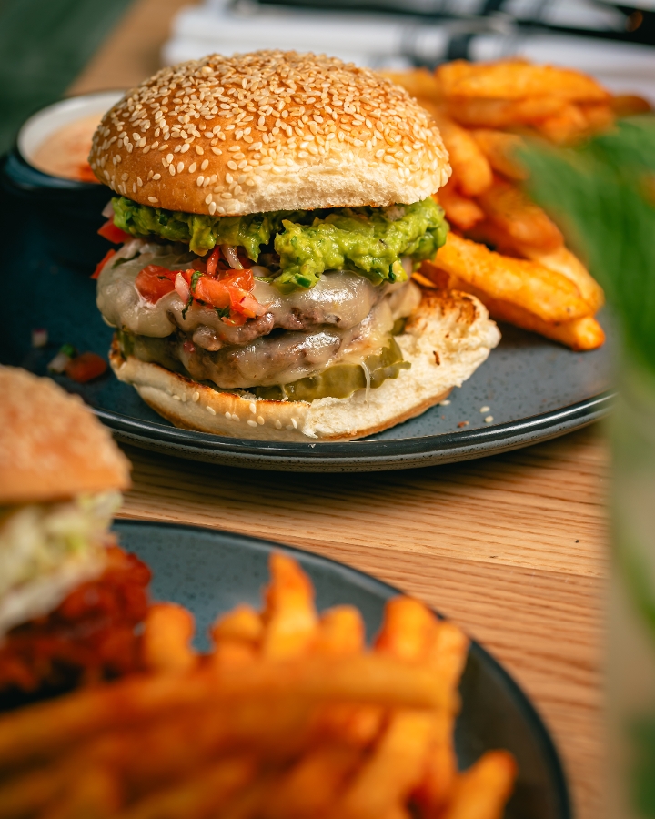double patty, pepper jack cheese, sesame potato bun, , guacamole, served with fries