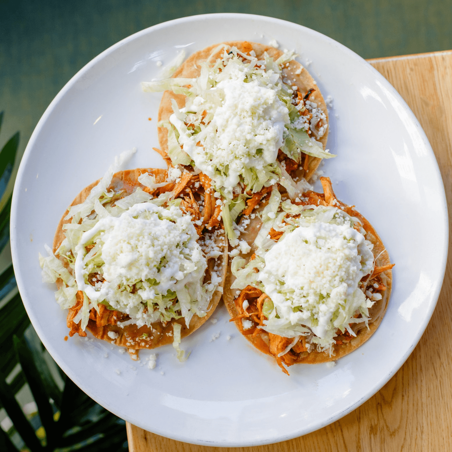 Shredded Chicken, Refried Beans, Lettuce, Queso Fresco, Crema, Crispy Tortilla.
