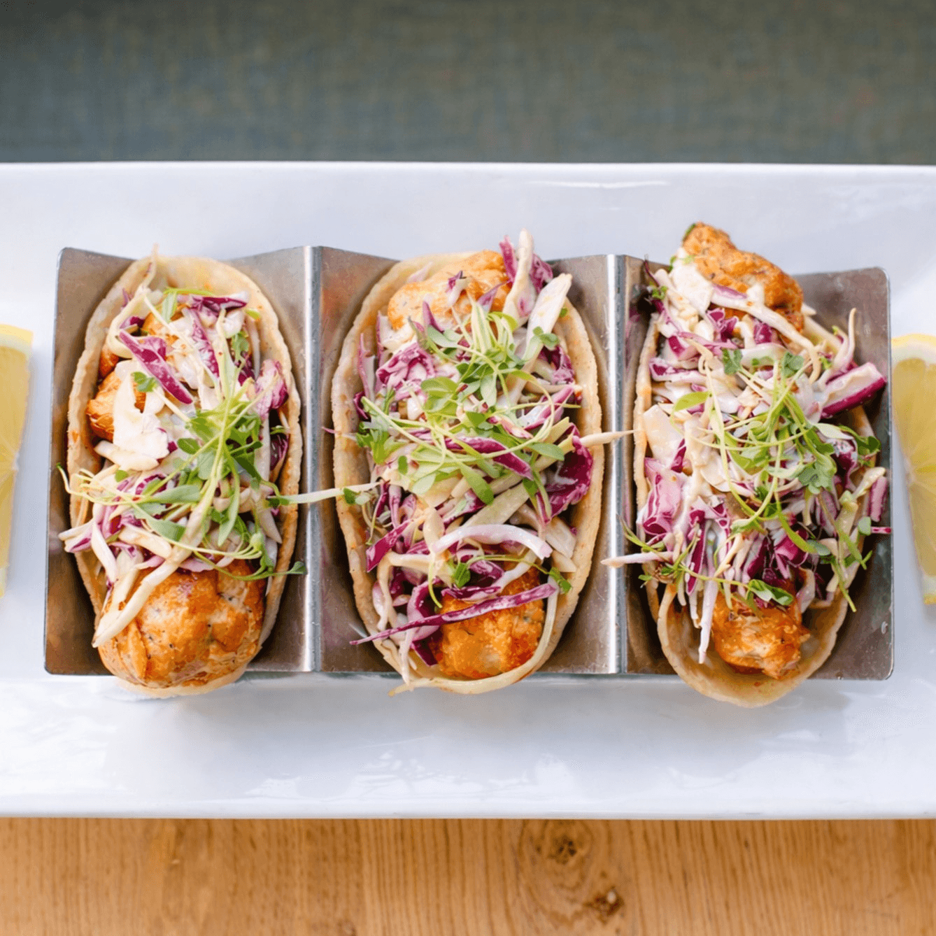 avocado, pickled onions, spicy mango sauce, cabbage slaw, micro greens