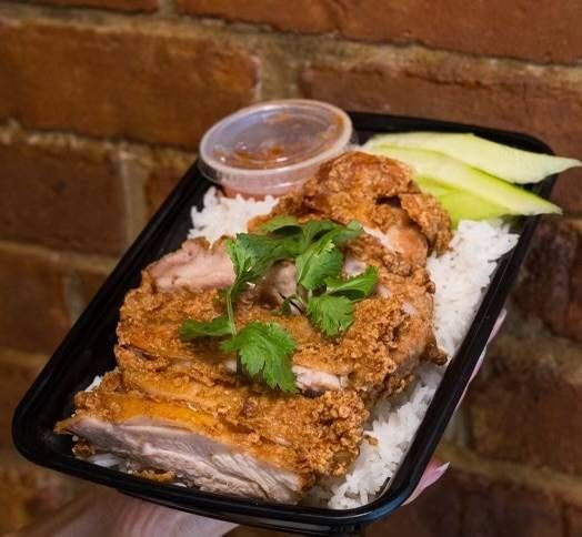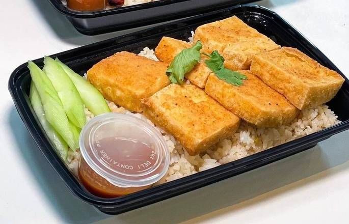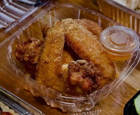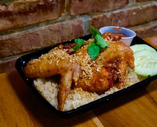 Crispy fried chicken wings over rice, topped with crunchy crumbs, cucumber, and a side of dipping sauce