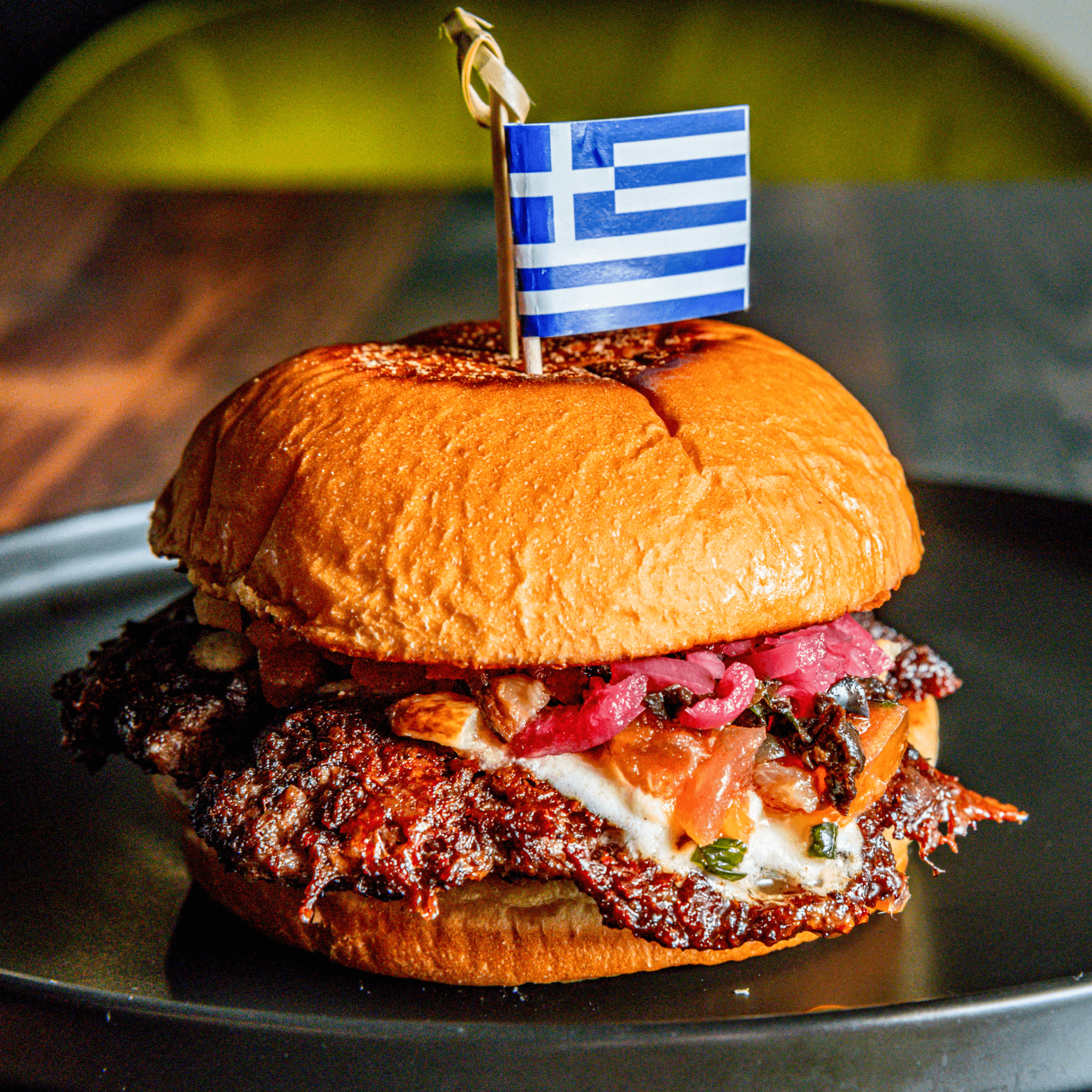 Premium beef, feta cheese cream, marinated tomatoes & red onions, roasted garlic cream, and olive tapenade.