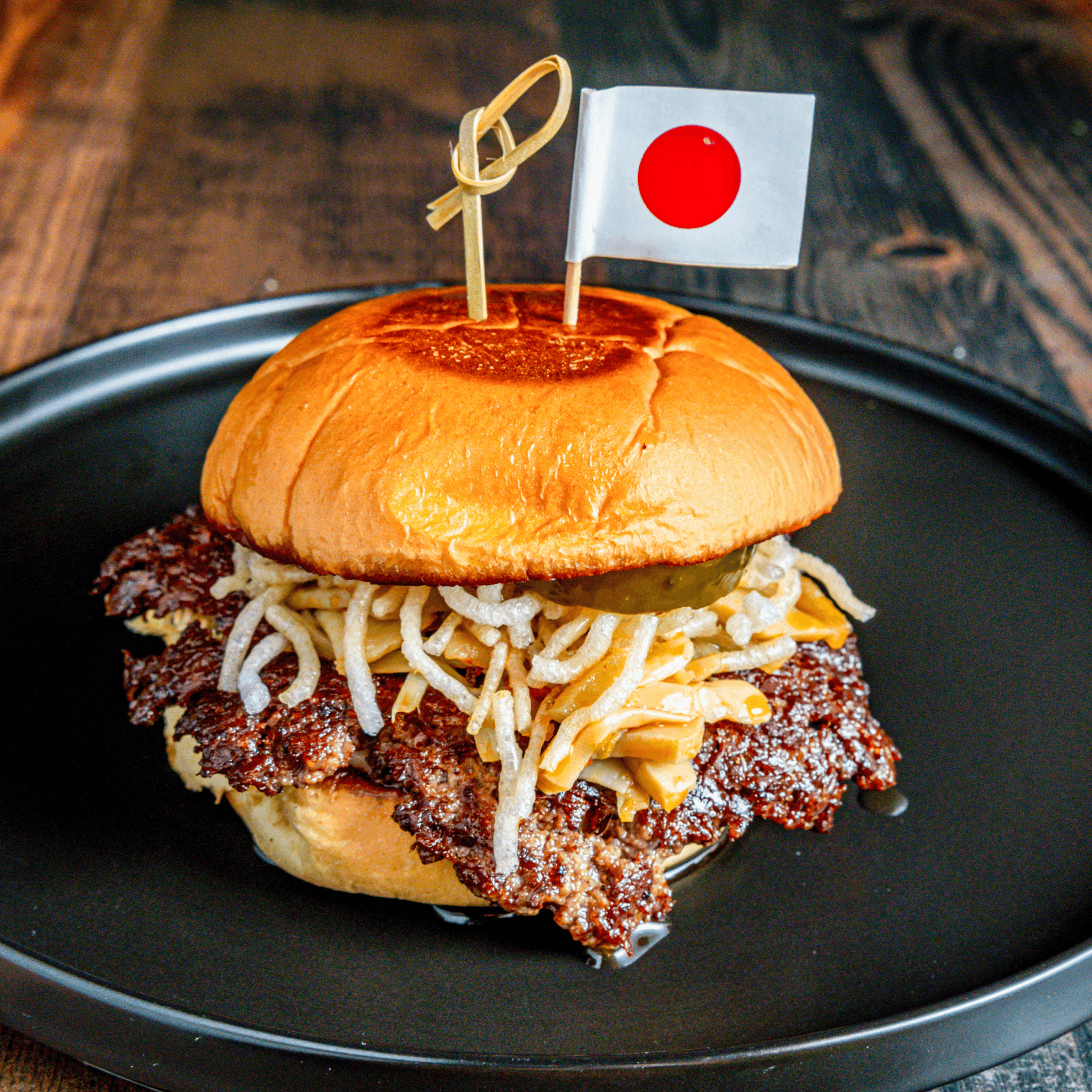 Premium Wagyu beef pickled Asian vegetables crispy rice noodles furikake/Togarashi and kewpie mayo.