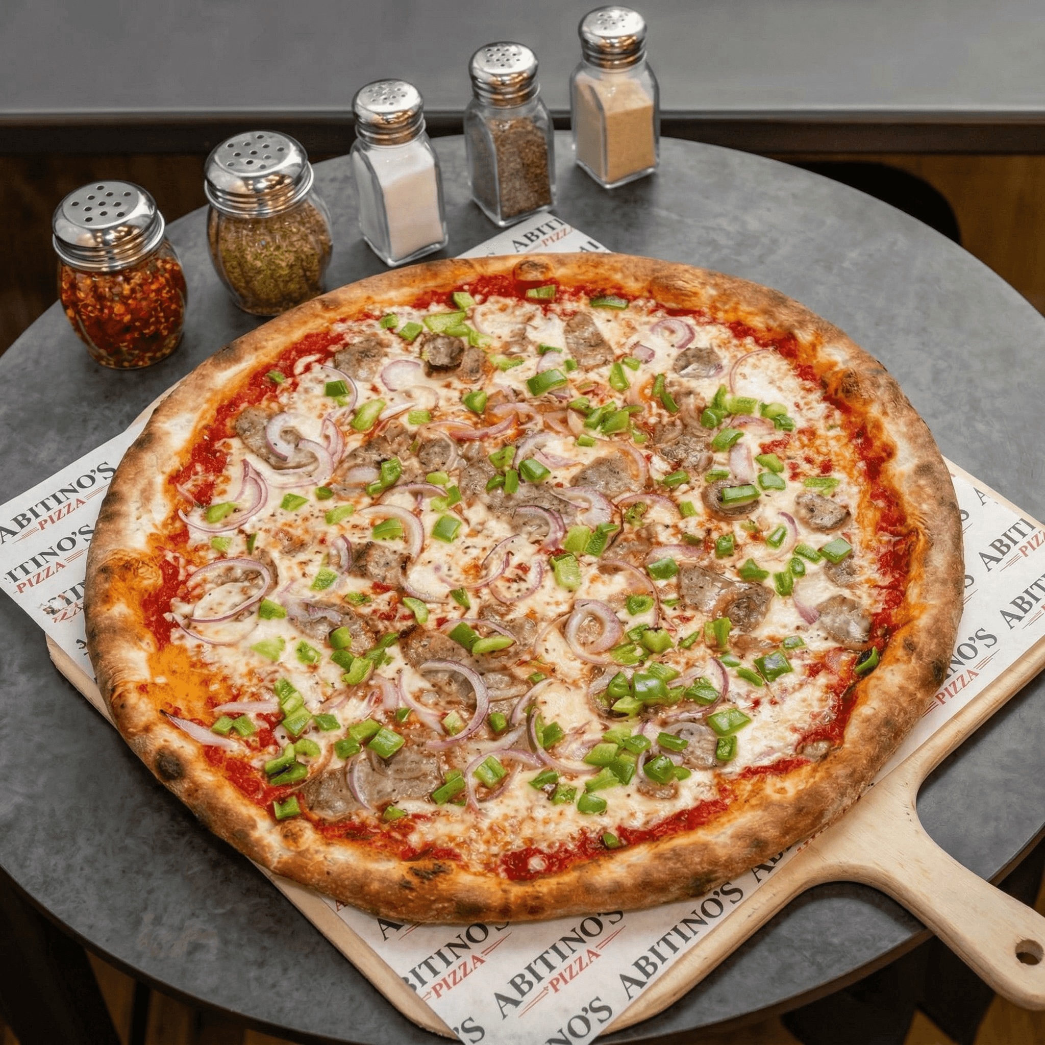 Sausage, pepperoni, bell peppers, red onion, sauce, mozzarella