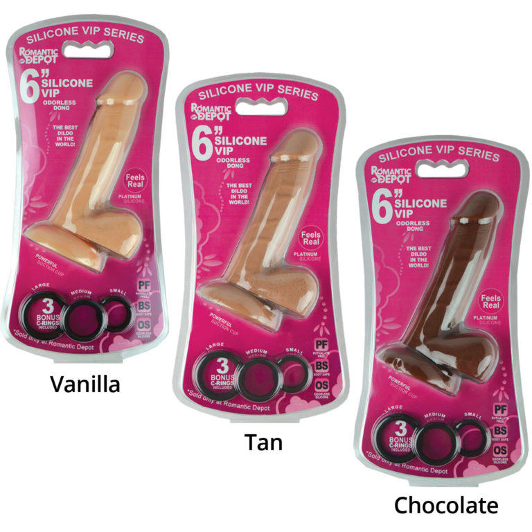 The Silicone 6” VIP Dildo comes with 3 extra cock rings! Strong suction cup for solo fun. Also harness compatible. Available in 3 colors, Vanilla, Tan and Chocolate. This is THE BEST and MOST SAFE material for dildos because it is non-porous. Yes, its more expensive than rubber and other cheap materials, but the only reason that some sellers sell silicone dildos for $100 is because well… they can. Due to the high quantity of dildos we sell, we’ve priced The Romantic Depot Silicone VIP Dildo at a extremely low price, cause we can! This dildo can last for 5 – 10 years years or more, feels completely realistic, is flexible, and has a suction cup that we designed to stick and STAY stuck, so that you can enjoy it in 100 different ways. Enjoy!! (Save your hard earned money and enjoy the Romantic Depot VIP Dildo line. We also recommend our VIP Anti Bacterial Toy Cleaner to add longevity to your toys life!