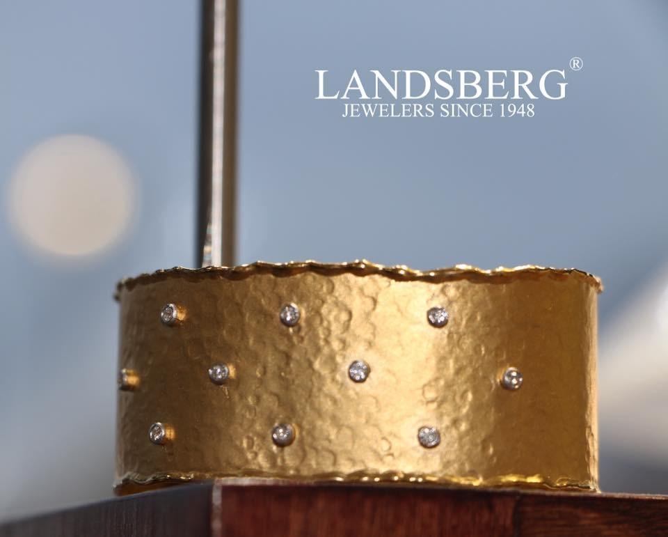This fantastic cuff is made of 14k matte hammered gold enhanced with .30 carat bezel set scattered diamonds.