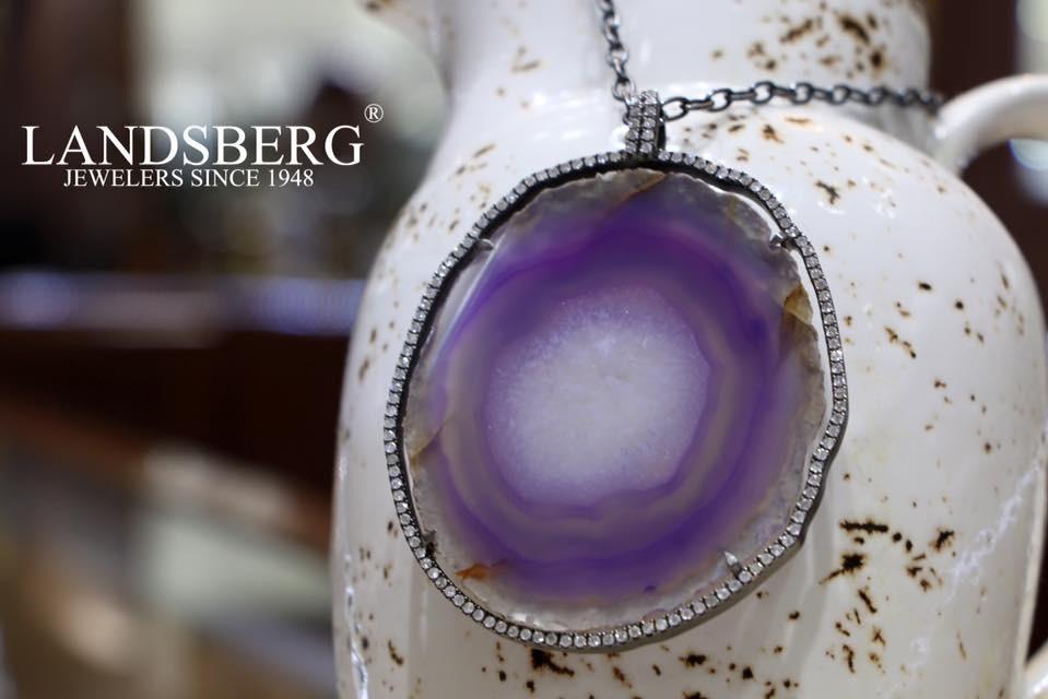 Link: S & R purple agate geode pendant, surrounded by full cut diamonds all set in blackened silver.