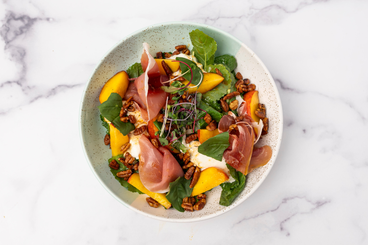 The true star of this salad is the luscious stone fruit, offering a burst of sweetness that perfectly complements the savory elements of the dish. Basil, prosciutto, candied pecans, burrata, baby kale w/ a honey cayenne vinaigrette. Allergens: N = Contains Nuts, D= Contains dairy